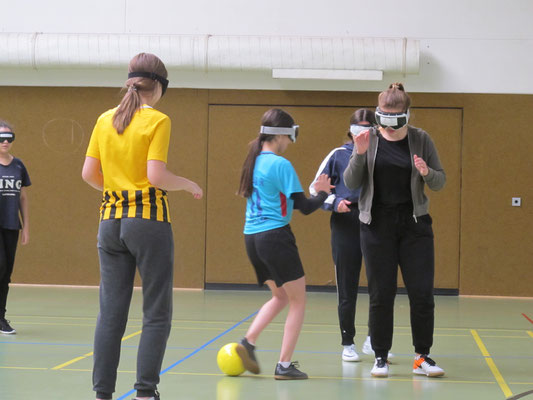Mit ihnen spielten wir Blindenfußball. Dafür bekamen wir extra eine Brille durch die man gar nichts sehen konnte und einen Ball, welcher Geräusche macht, wenn er rollt.